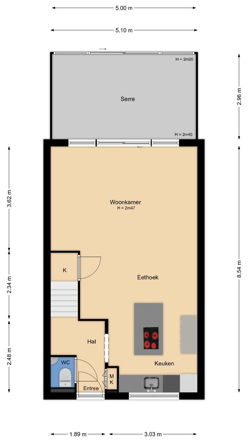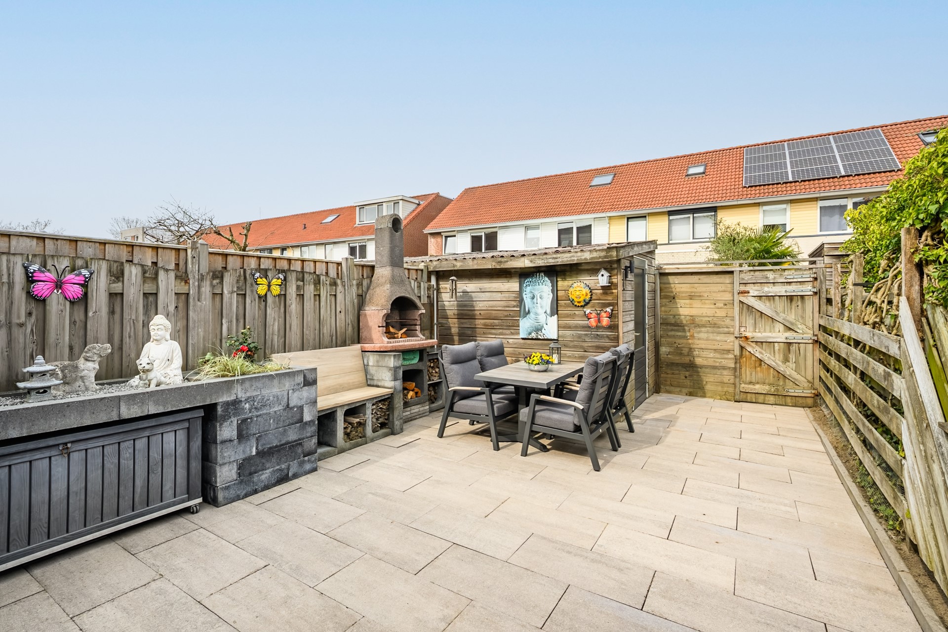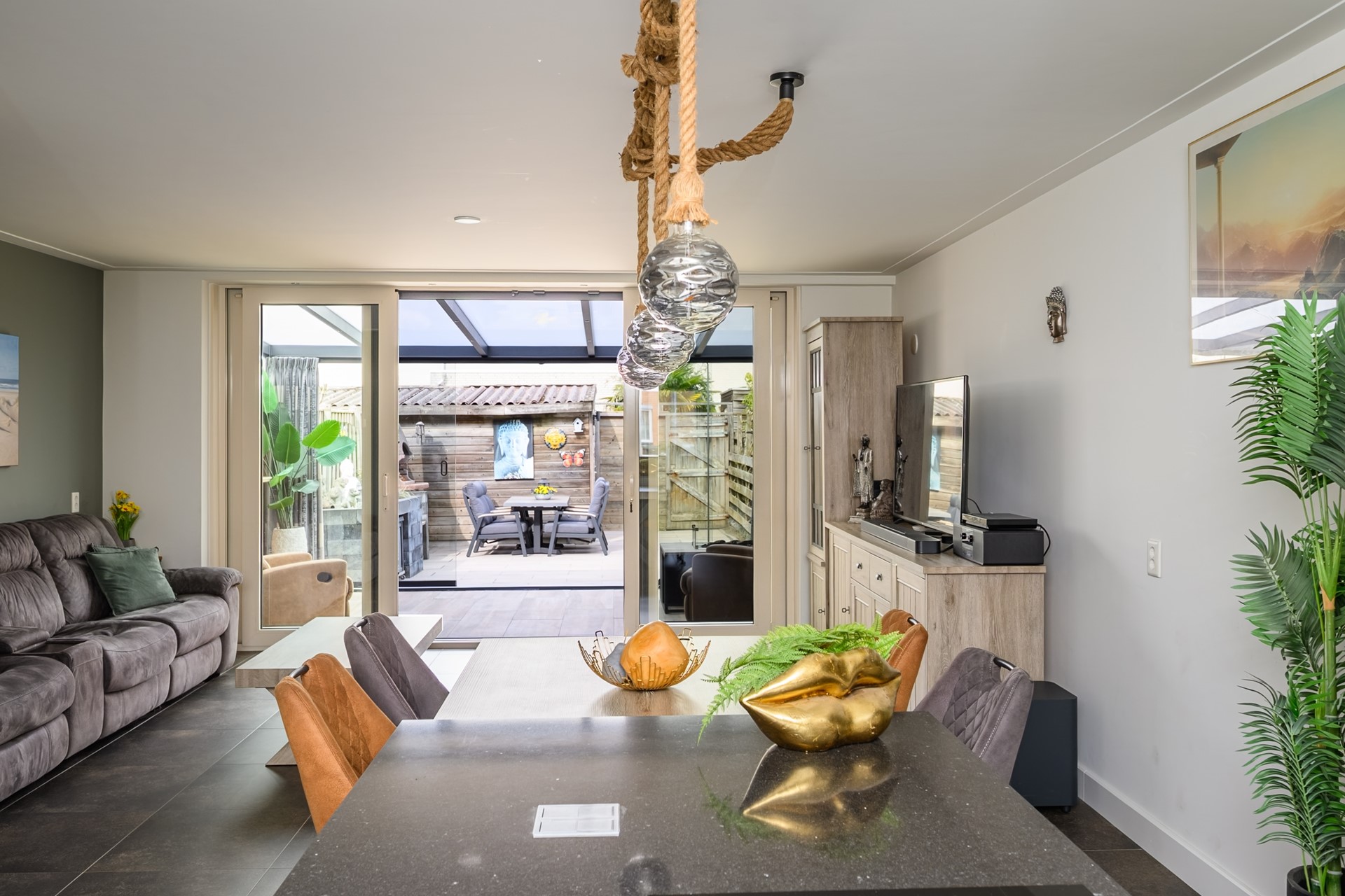 Via the neat front garden, you enter the spacious hall through the entrance, where the meter cupboard, the beautifully finished toilet with Geberit fittings, the wardrobe, and the staircase to the 1st floor are located. The generous open living room features large sliding doors that provide access to the bright garden room located at the rear. A delightful garden room where all glass sliding doors can be opened for wonderful summer evenings! The sunny, neat back garden faces northwest and features a detached wooden shed with electricity and a back entrance. Located at the front of the house is the very modern open kitchen, including a kitchen island, equipped with high-quality built-in appliances such as a Bora induction hob with integrated extraction system, Bauknecht dishwasher, Bauknecht refrigerator, Bosch freezer, Bauknecht combination microwave, individual Bauknecht oven, and Quooker tap.