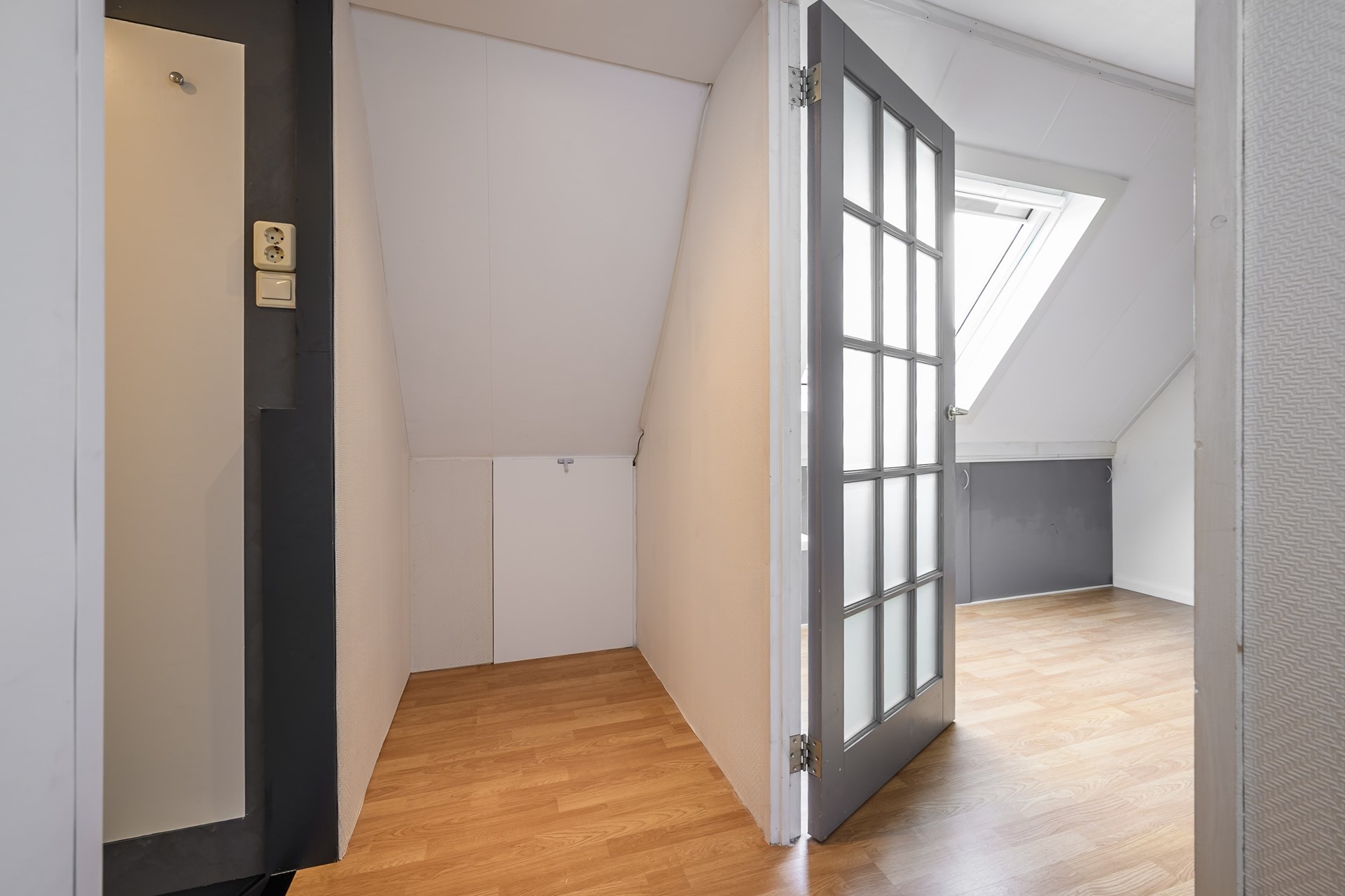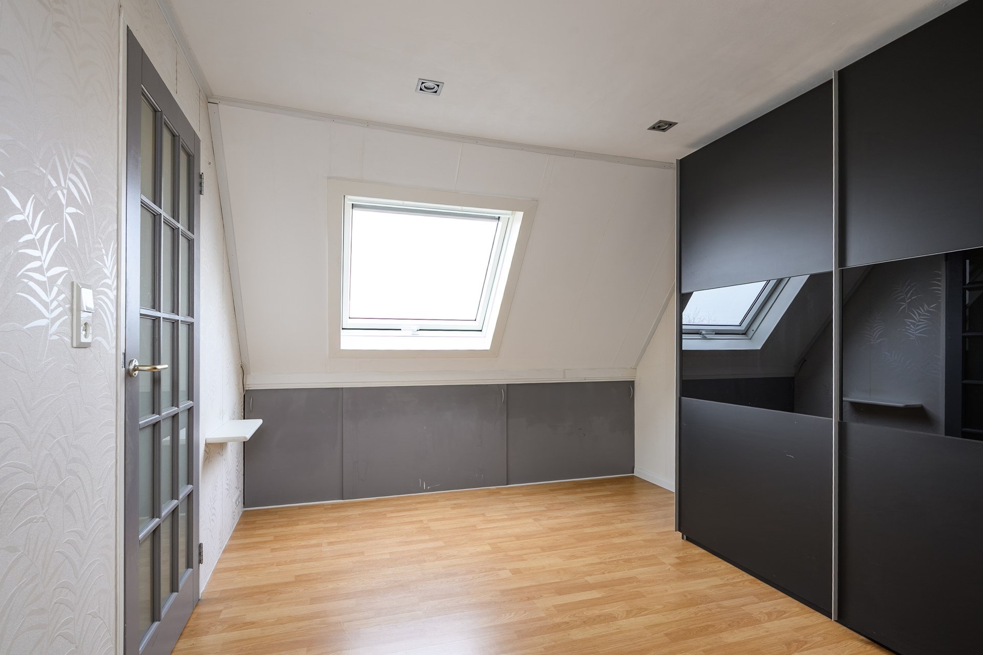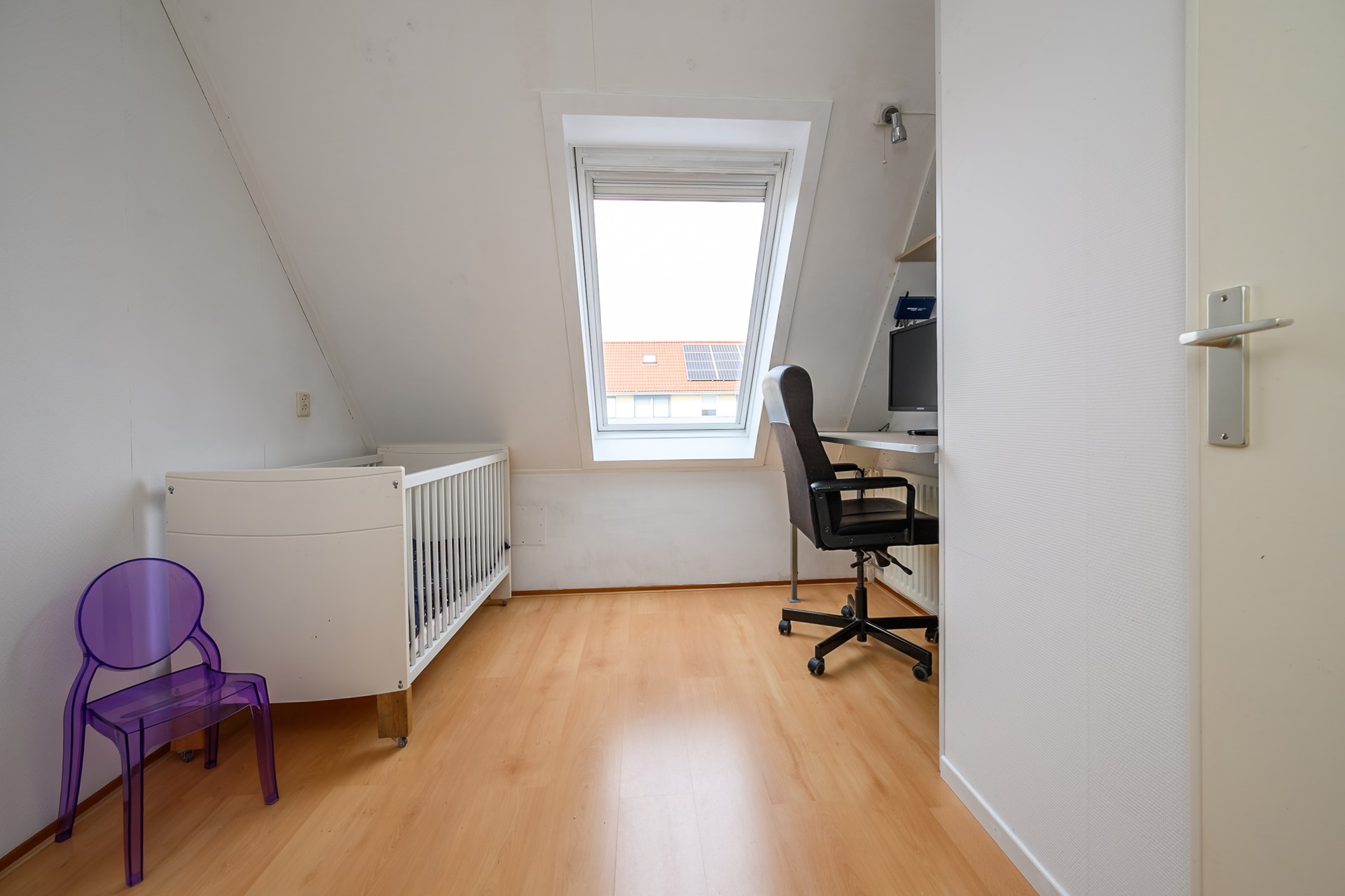 A pleasant and spacious attic floor with a very spacious bedroom; this is also equipped with a new Keylite skylight with an integrated pleated blind. The extra loft, accessible via a loft ladder, can be used as additional storage space. The washing machine and dryer connections, the mechanical ventilation system, and the inverter for the 12 (2-group) solar panels are also located in the attic.