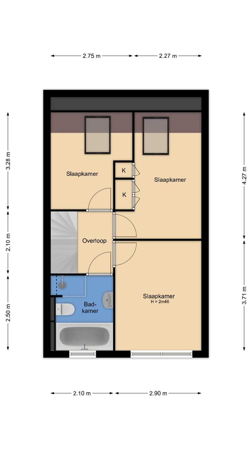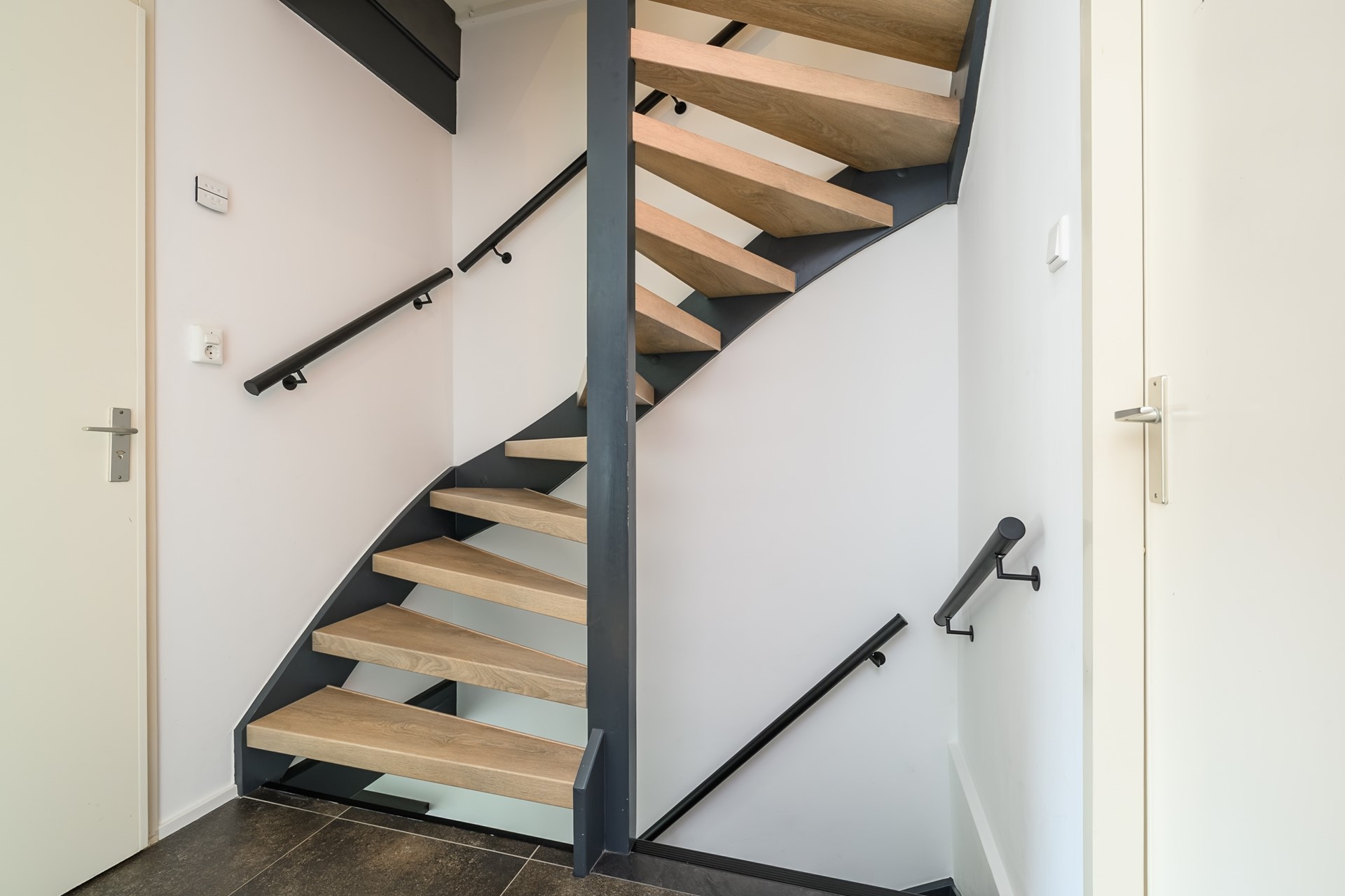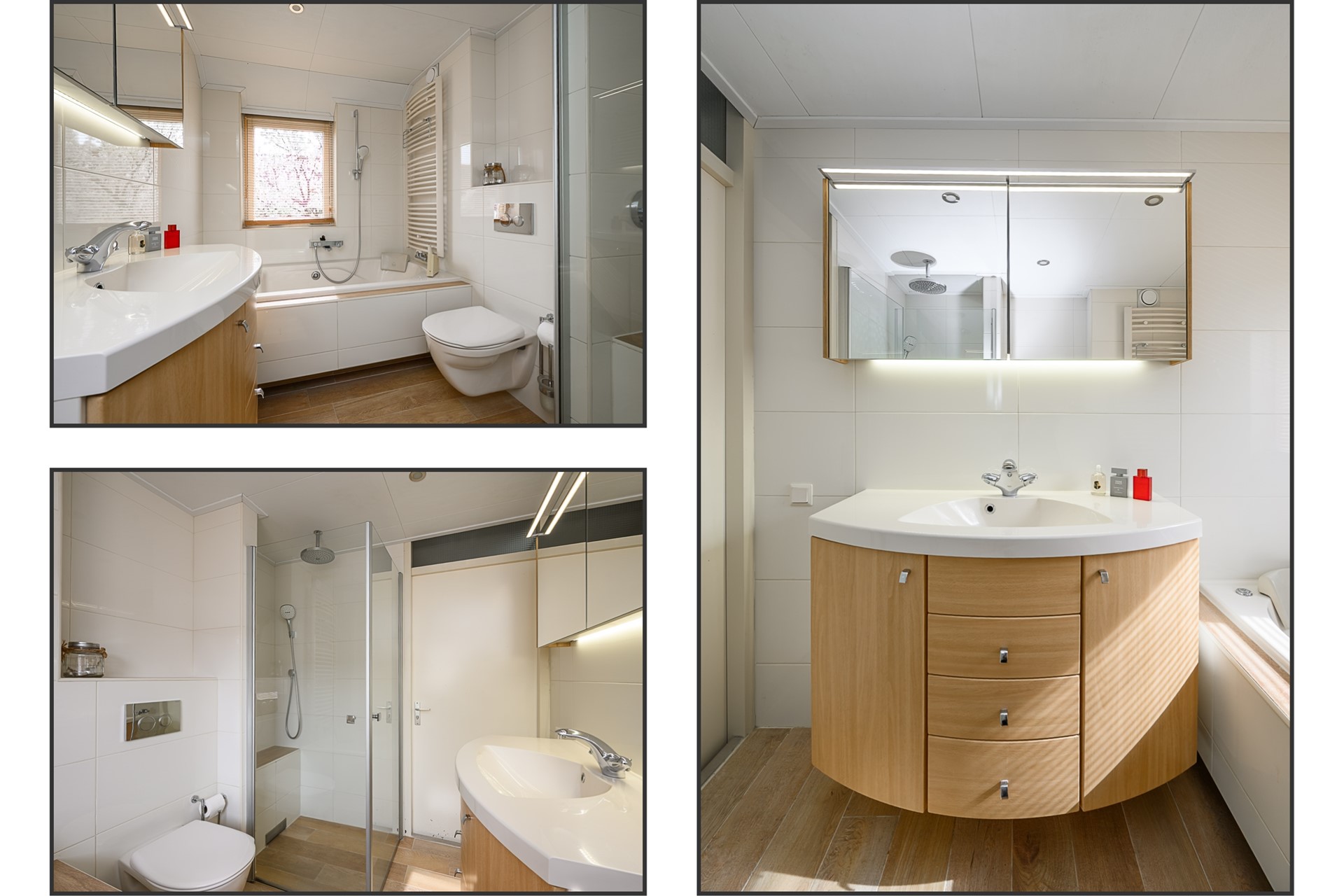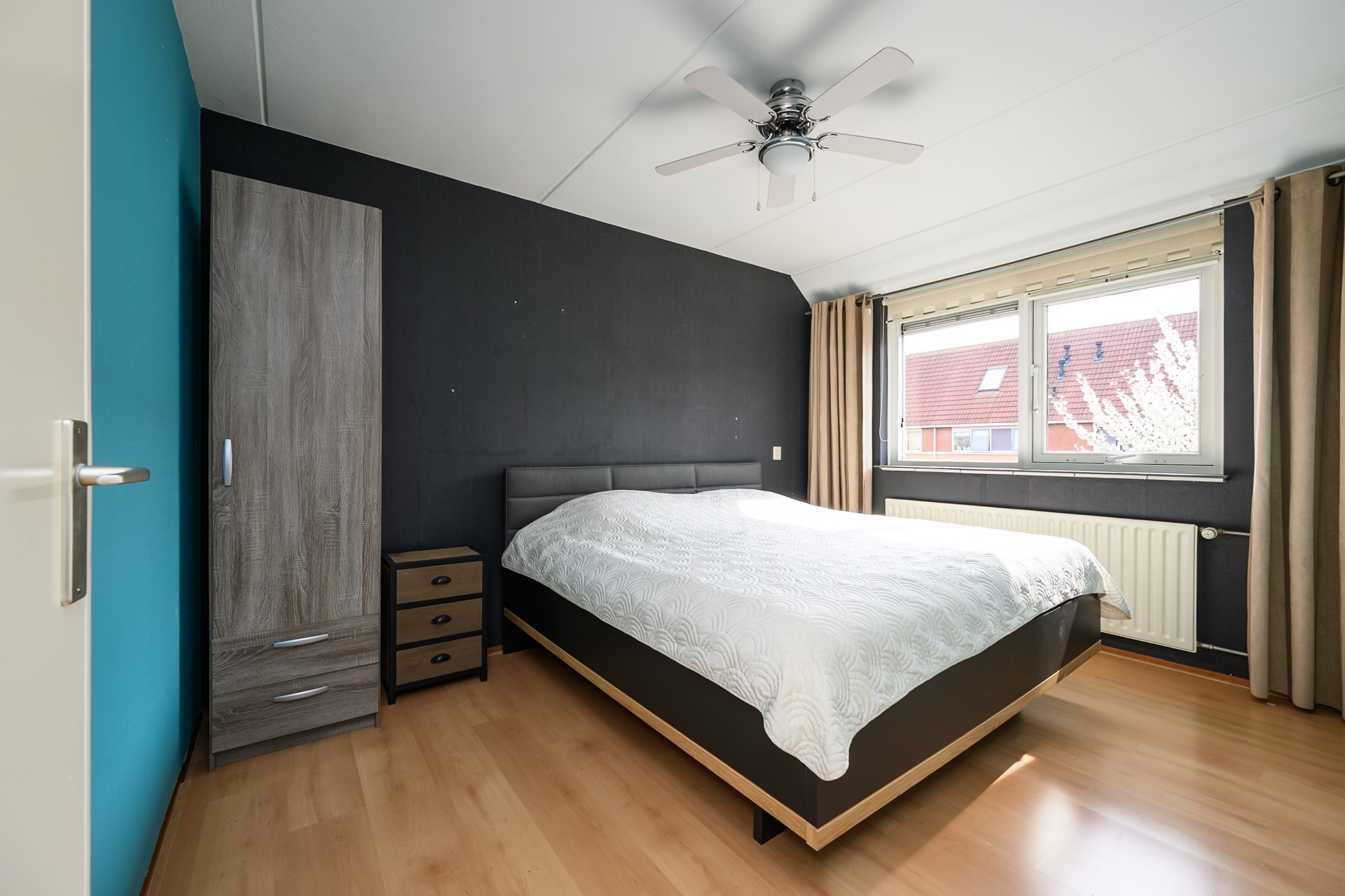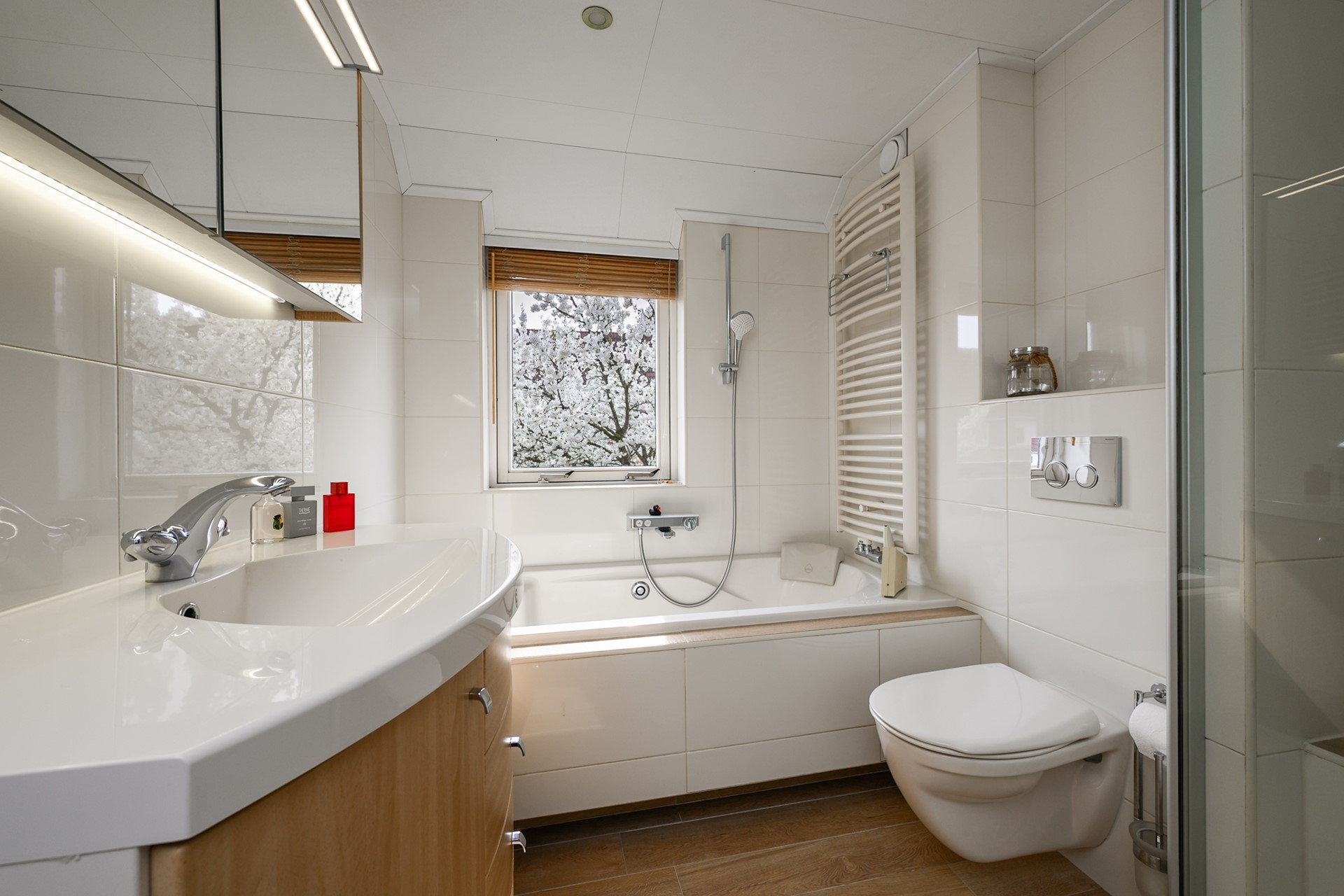 The bright landing with a modernized staircase provides access to three bedrooms of varying sizes, with the master bedroom located at the front. The two rear bedrooms are equipped with Velux skylights. Blackout and standard roller blinds are also located here. The luxurious bathroom is equipped with a spacious walk-in shower with a thermostatic tap and a rain shower, a bathtub with a jacuzzi function, a wall-mounted second toilet, and a designer radiator. There is a tilt window for extra ventilation.On the first floor, all bedrooms feature neat laminate flooring.