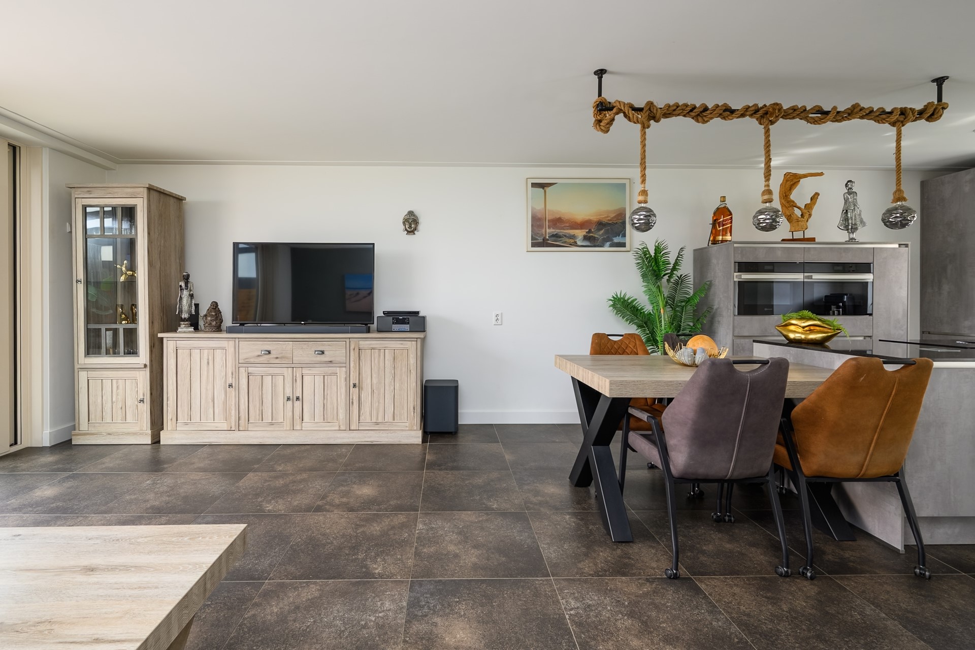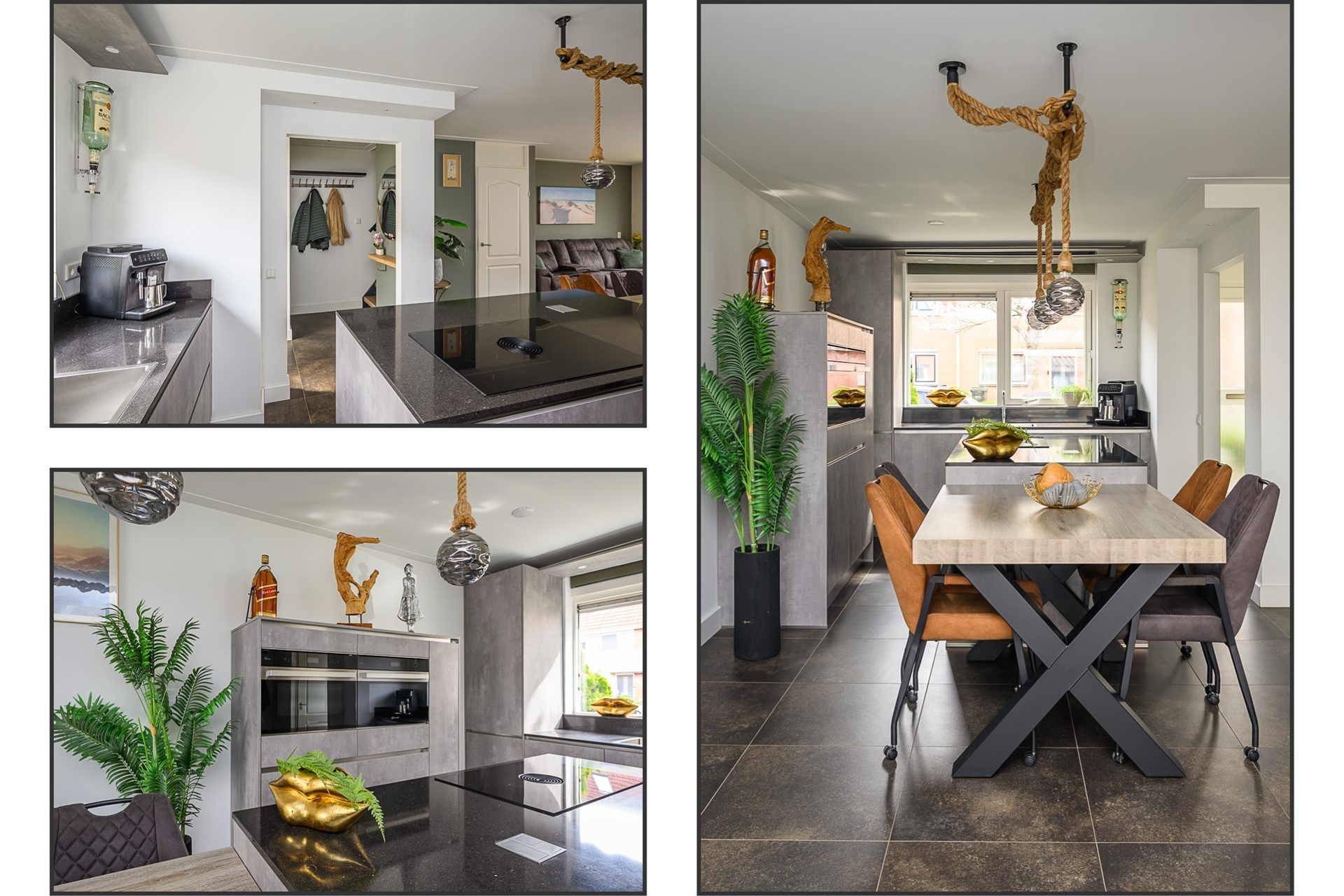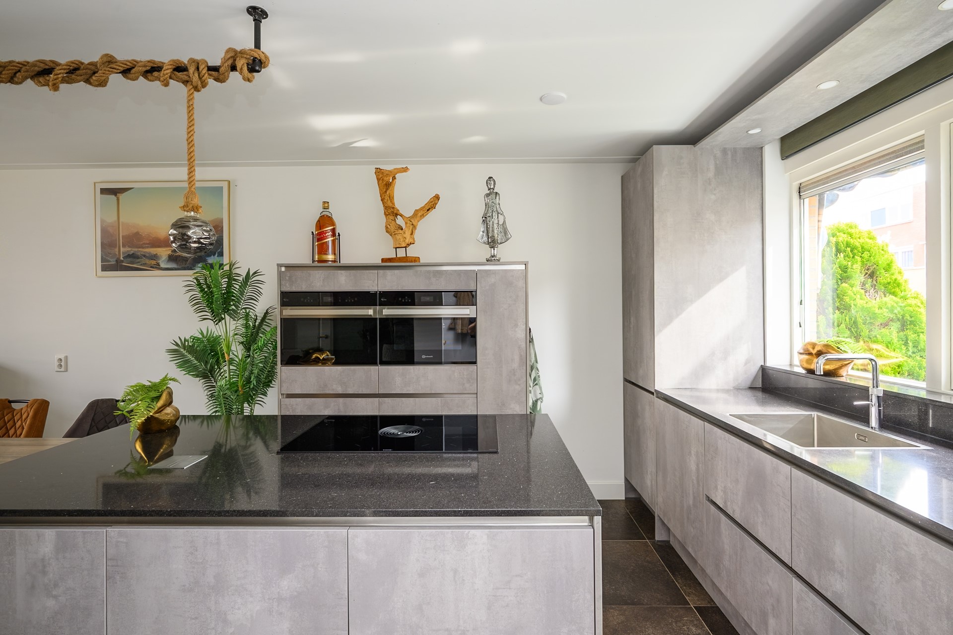 Aan de voorzijde van de woning bevindt zich de zeer moderne open keuken inclusief kookeiland voorzien van hoogwaardige inbouwapparatuur zoals Bora inductie kookplaat met intern afzuigsysteem, Bauknecht vaatwasser, Bauknecht koelkast, Bosch vriezer, Bauknecht combimagnetron en individuele Bauknecht oven en Quooker kraan.