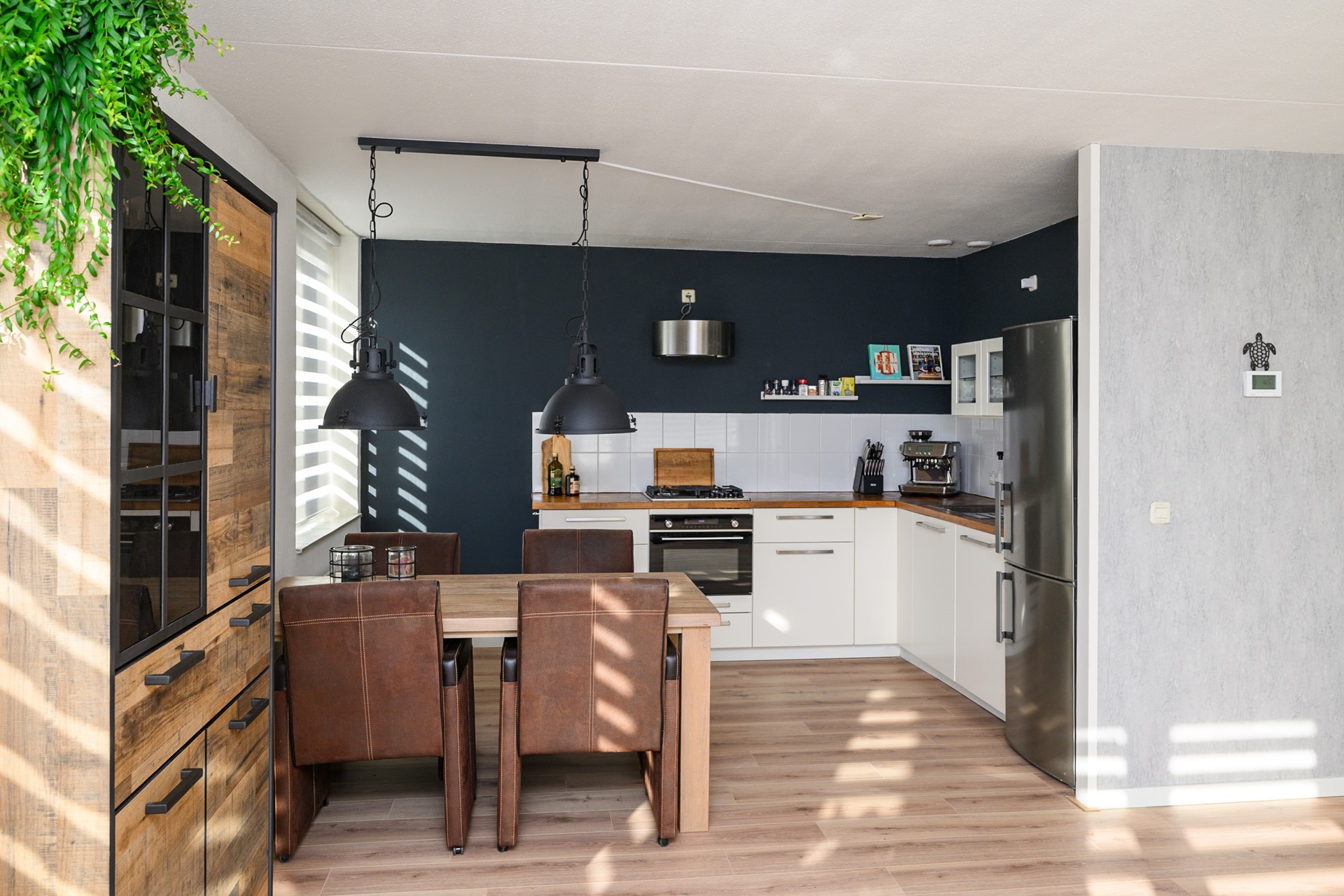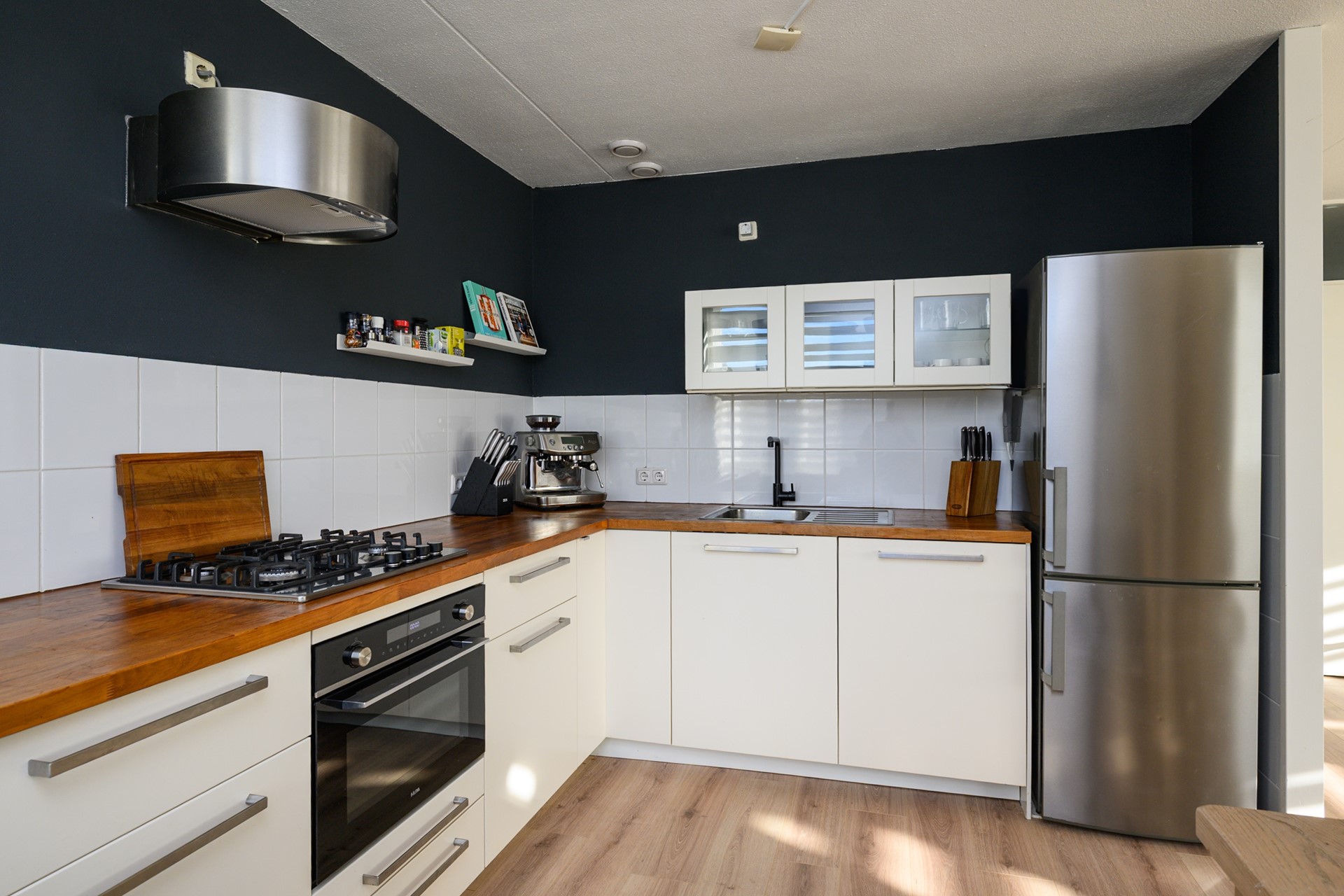 Naast al deze kamers leidt de hal ook nog eens naar de royale speelse woonkamer, met veel natuurlijk lichtinval en de inbouwkeuken. De keuken is afgewerkt met: