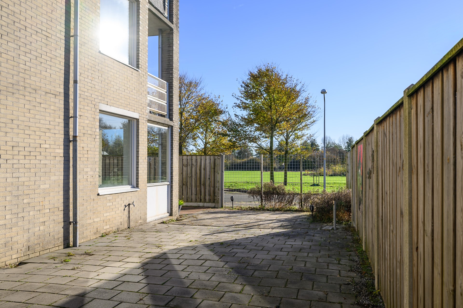 * Grote half-circulair sierbestraatte achtertuin met open ligging.