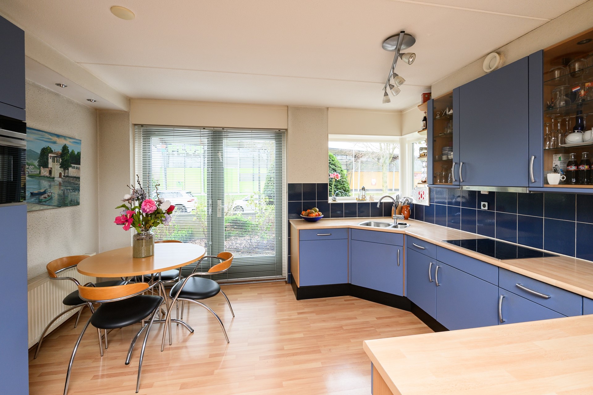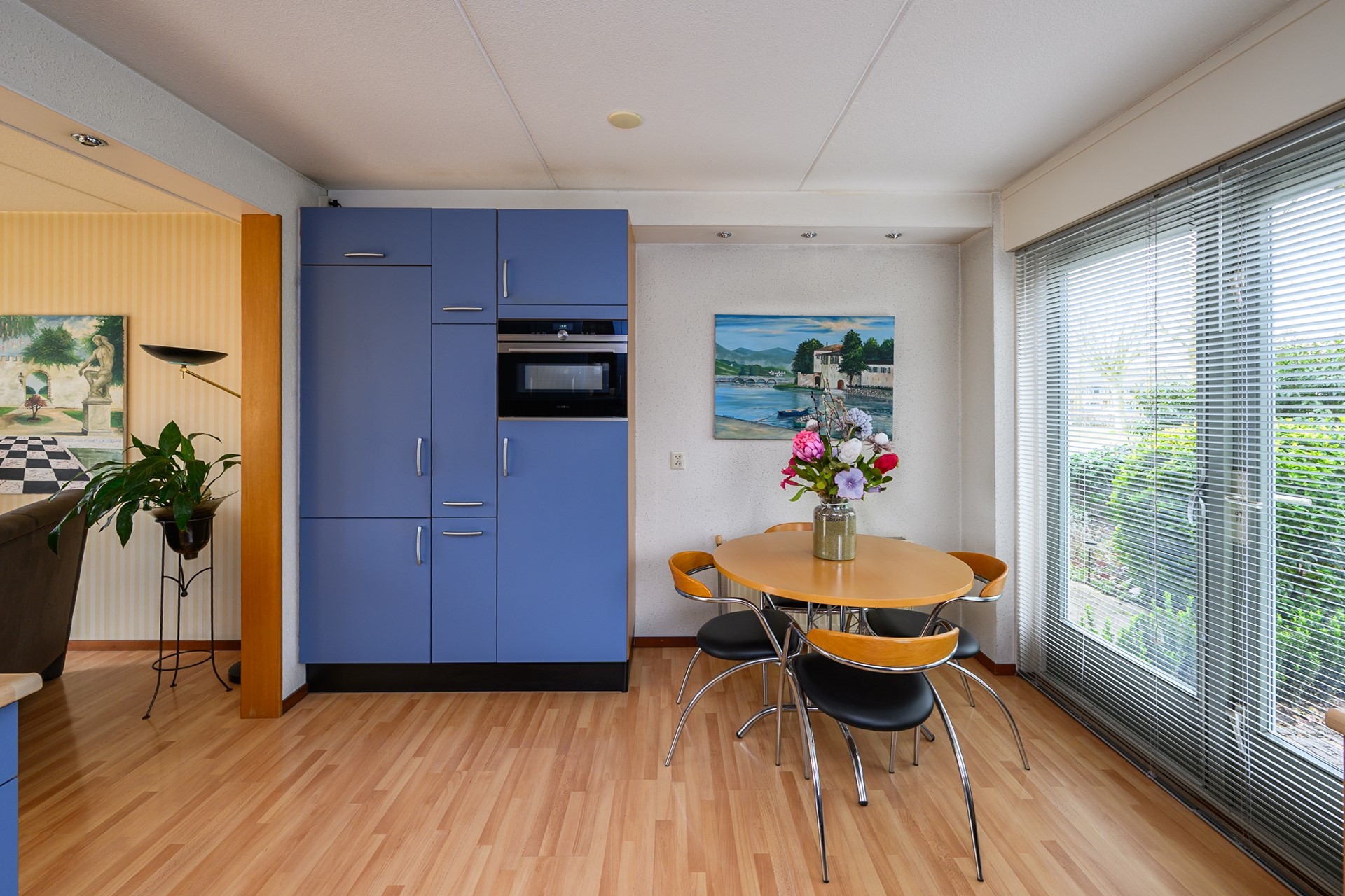 You enter through a stylish entrance. The hallway includes the meter cupboard, a toilet, a hardwood open staircase, and access to the bright, garden-facing living room. The living room offers ample space for a large dining table, perfect for enjoying meals with family and friends. The semi-open kitchen was partially renovated in 2023 and is equipped with various built-in appliances, while retaining practical features such as a carousel cabinet, tall pantry cabinet, and ceramic hob.