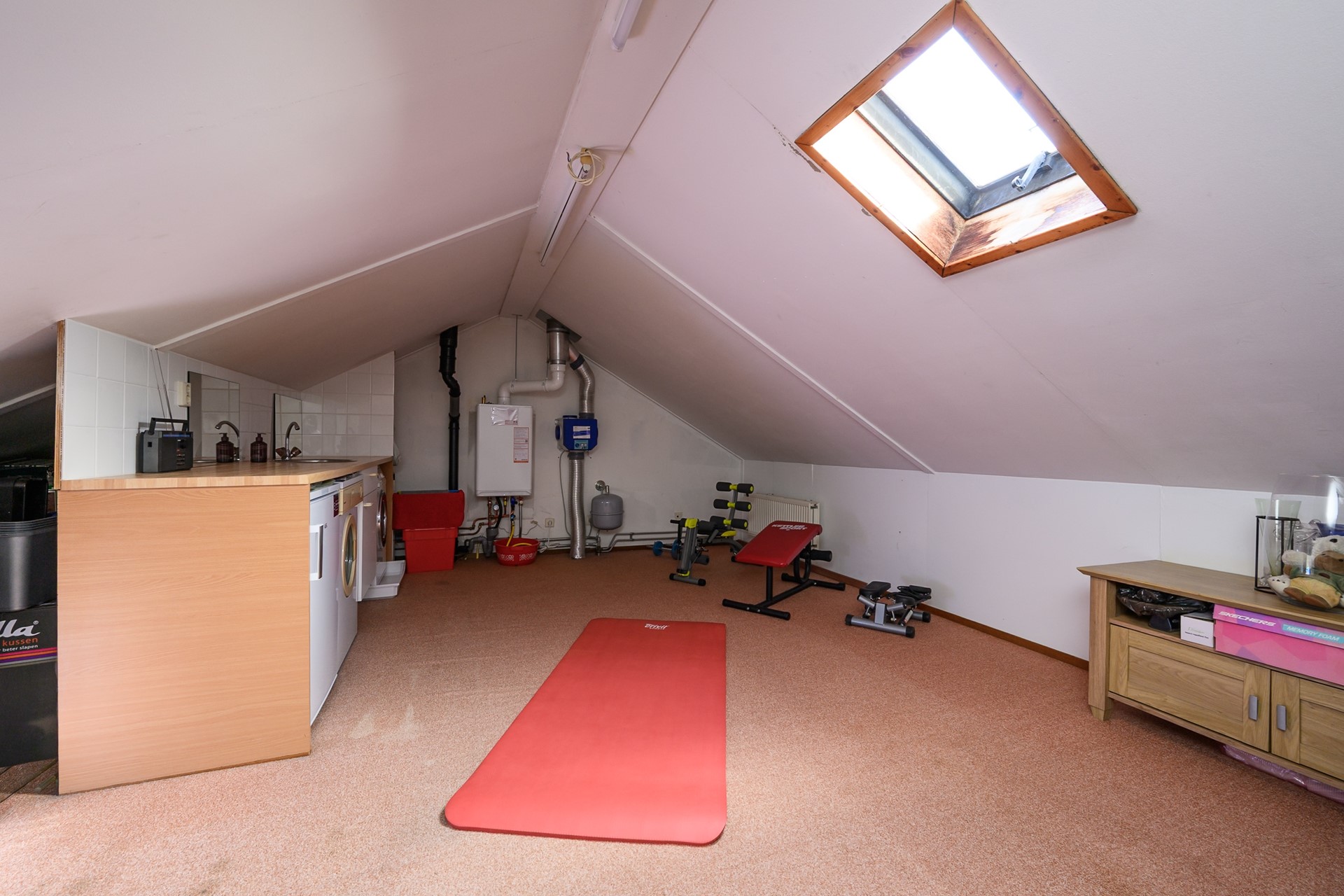 A very spacious attic covering the entire width of the house, with the possibility to create an additional bedroom with a dormer window, as well as a workspace or hobby area, allowing for approximately 20 m² of extra living space. This floor also houses the washing machine and dryer, mechanical ventilation system, and the Intergas central heating boiler (both from 2020).