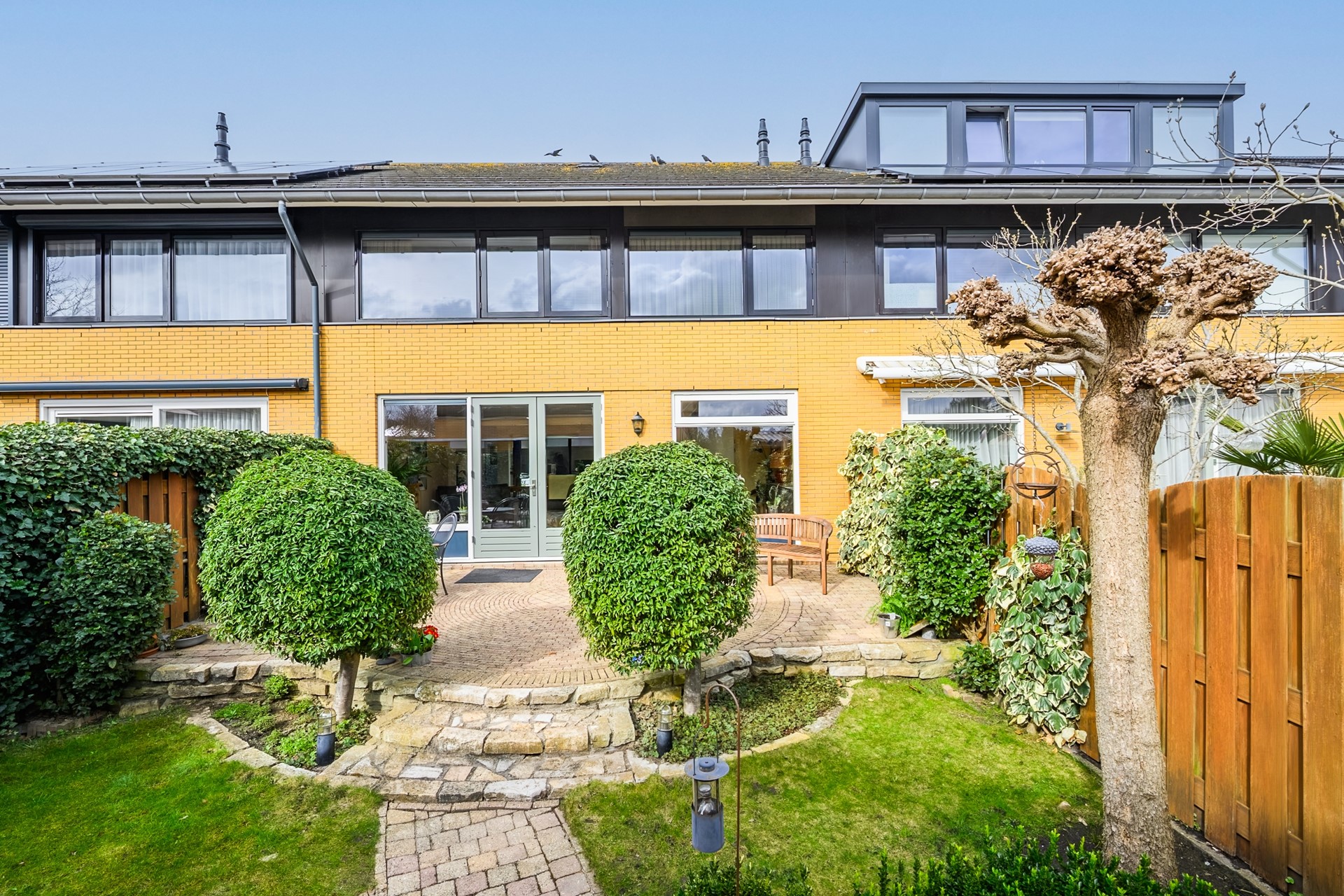 Thanks to the large windows and double French doors, you have direct access to the spacious and beautifully landscaped backyard, which faces southeast. The garden is well maintained and offers plenty of space to relax and enjoy outdoor living. There is also a storage shed for bicycles and a rear entrance.