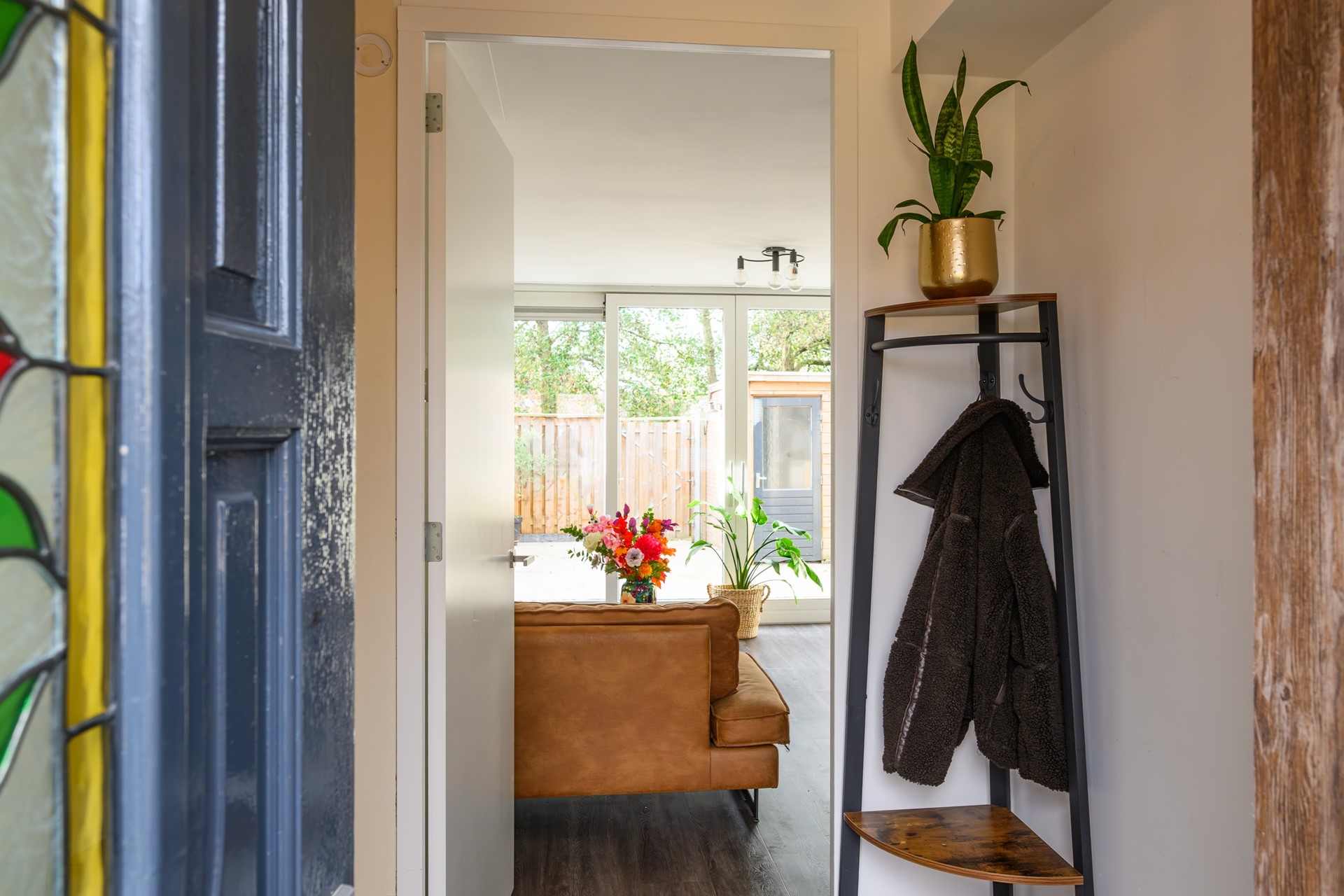 Entree/hal met de meterkast (incl. aansluiting glasvezelnetwerk), de keurige toiletruimte met toilet en de dichte trap naar de eerste verdieping.