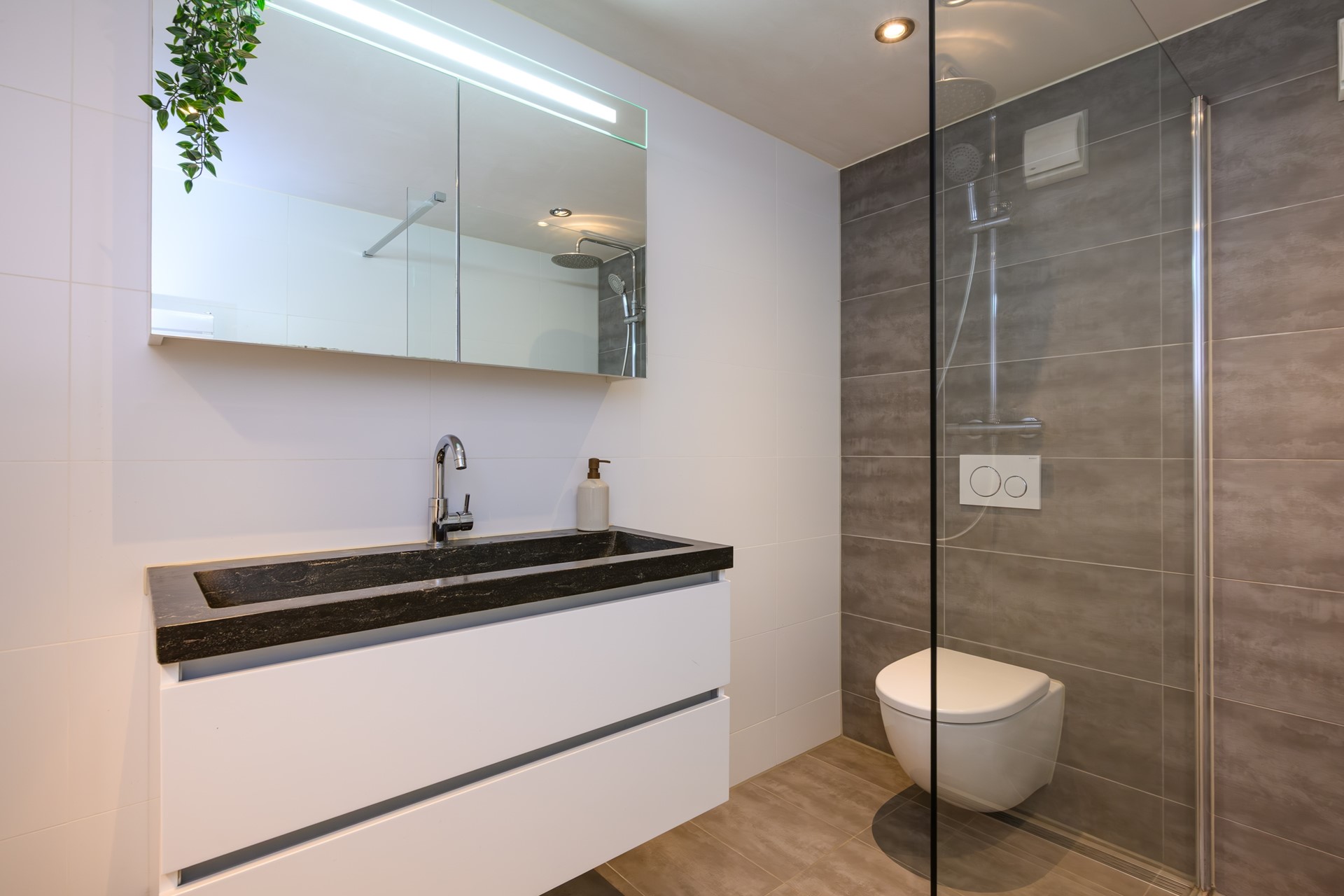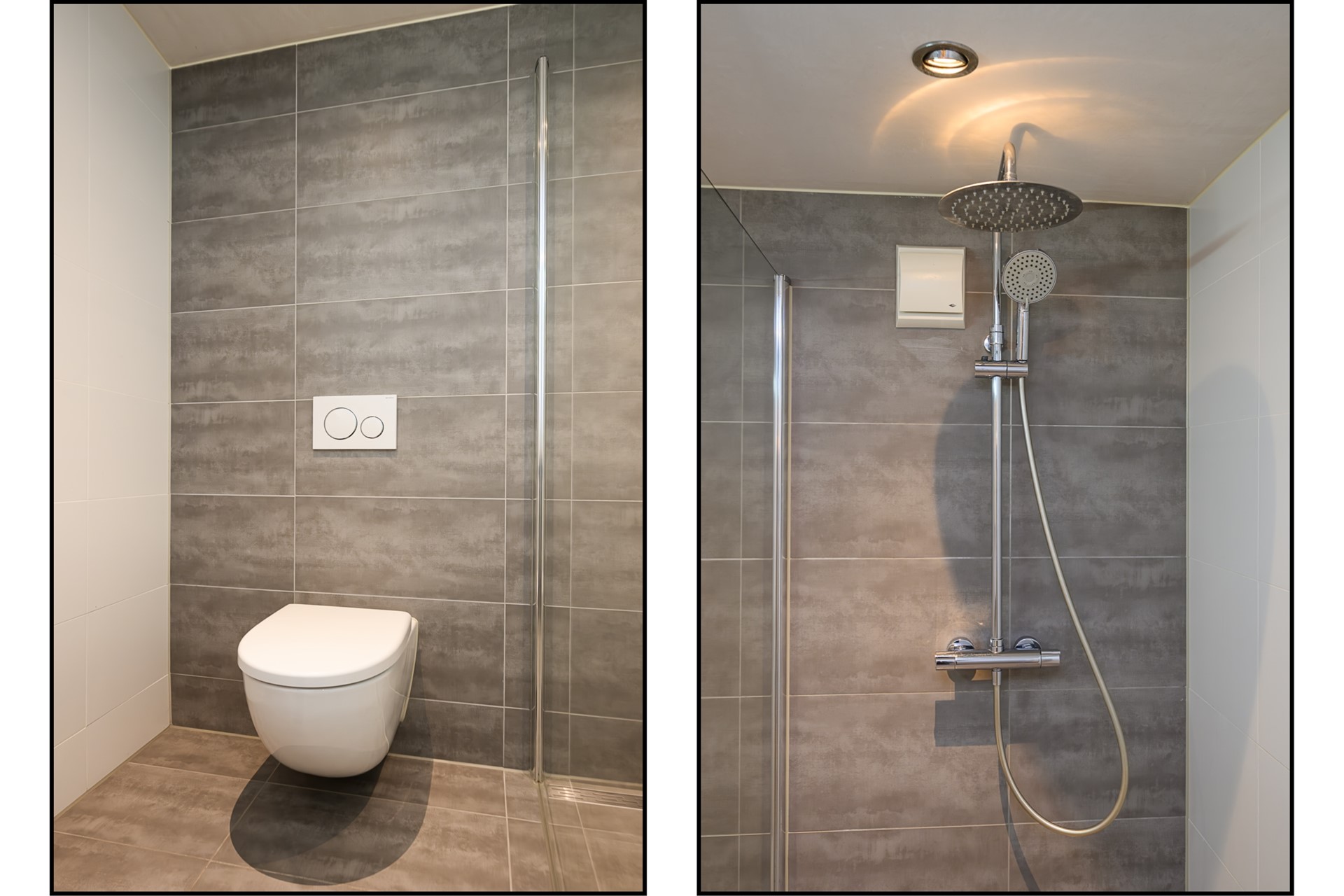 Deze heeft wandbetegeling in lichte kleurstelling tot het plafond, een vrijhangend wastafelmeubel, een aparte douche met regendouche, een designradiator en een tweede toilet.