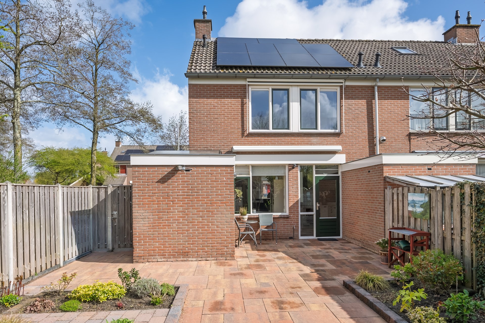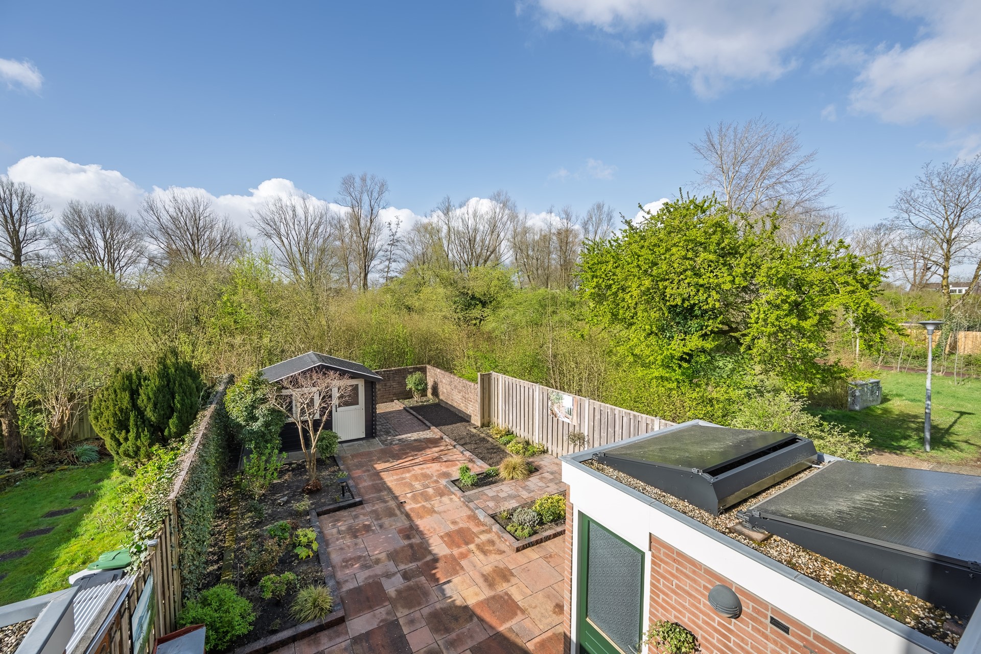 De sfeervol ingerichte riante, zonnige en diepe achtertuin ligt op het Zuidwesten, en is v.v. een elektrisch zonnescherm, borders, sierbestrating en een groot vrijstaand houten tuinhuis.